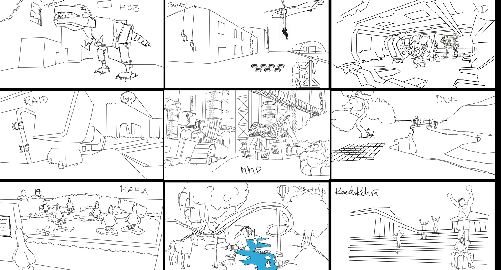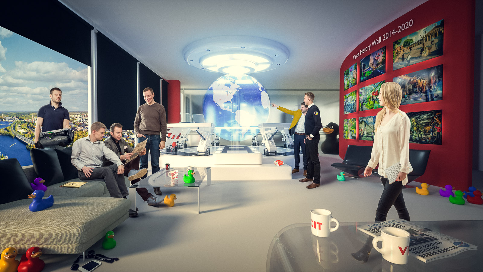 The project started by interviewing all the teams, catering small bullets of information what kind of image certain team would like me to create. I said that there are no limits. Imagine anything and I will do my best to create that. Some teams saw the future and their work in scifi environment, mobile team liked to have some new futuristic hologram displays and mobile devices in their pictures. Couple of teams hoped that there would be more women in the teams in the future. One team hoped unicorns shitting diamonds. Ideas that teams had were totally random. Some liked to have Chuck Norris and McGyver themed imaginary, some spaceships, electricity, bug control vechiles and penguins. Robot dinosaur, roller coasters, rocky statue, SWAT training course, Mechs, tesla coils, rockets, ninjas .. you get the point 😀