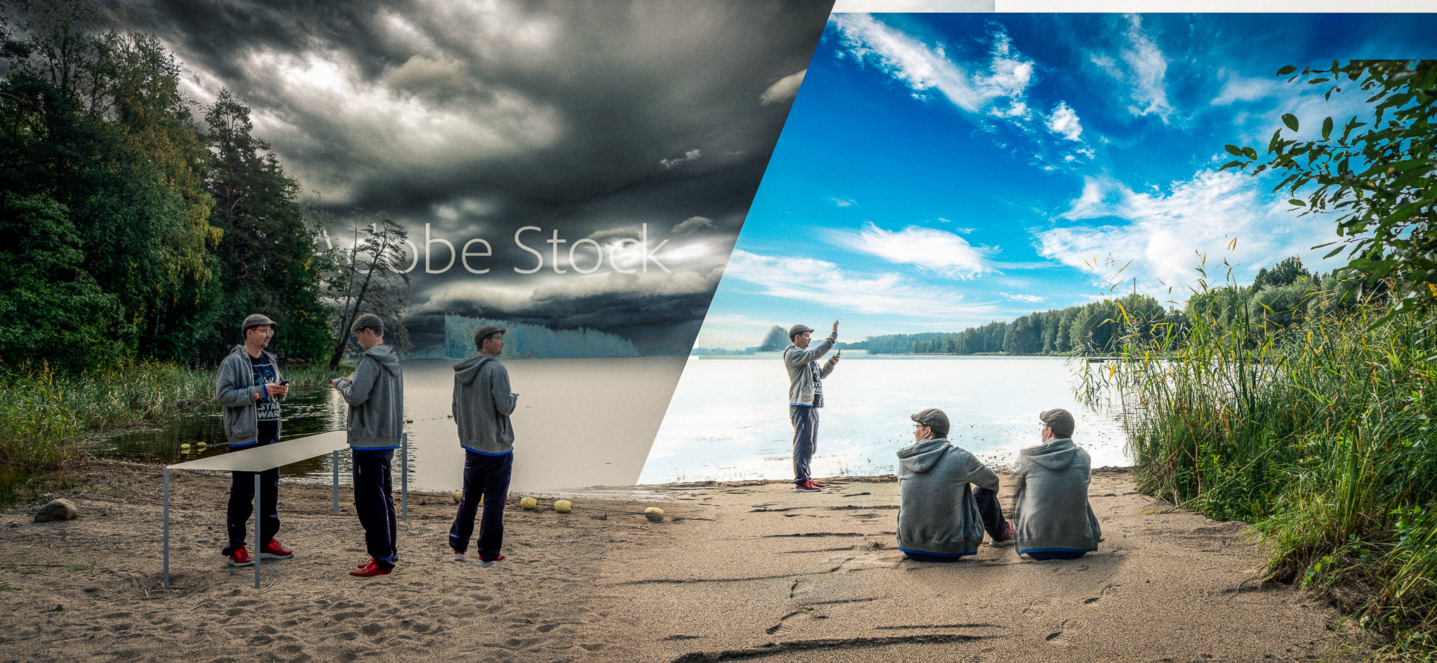 It took a couple of months before I finally realized this idea of an image will not leave me alone before I create it. The final boost for the idea was seeing the movie Ready Player One with cool visions about people immersing themselves in virtual reality. To make it even more personal, I took a walk to the nearby lake to take some shots of “our” beach and asked my wife and kids to portray the family in the picture. My trusted stylist Laura and her fiance played the part of the couple about to by VR glasses and some missing pieces such as the tropical scenery (we don’t have palms and turquoise water here in Finland) I got from Adobe stock images.
