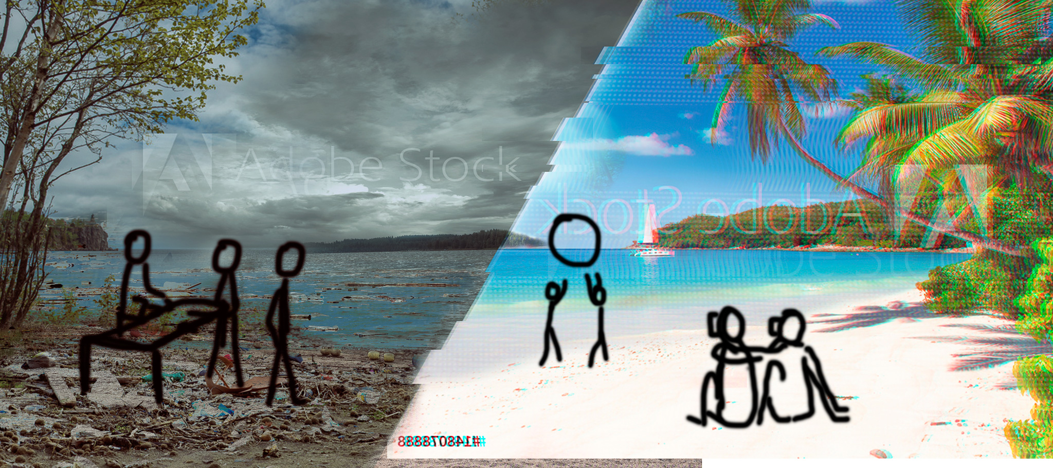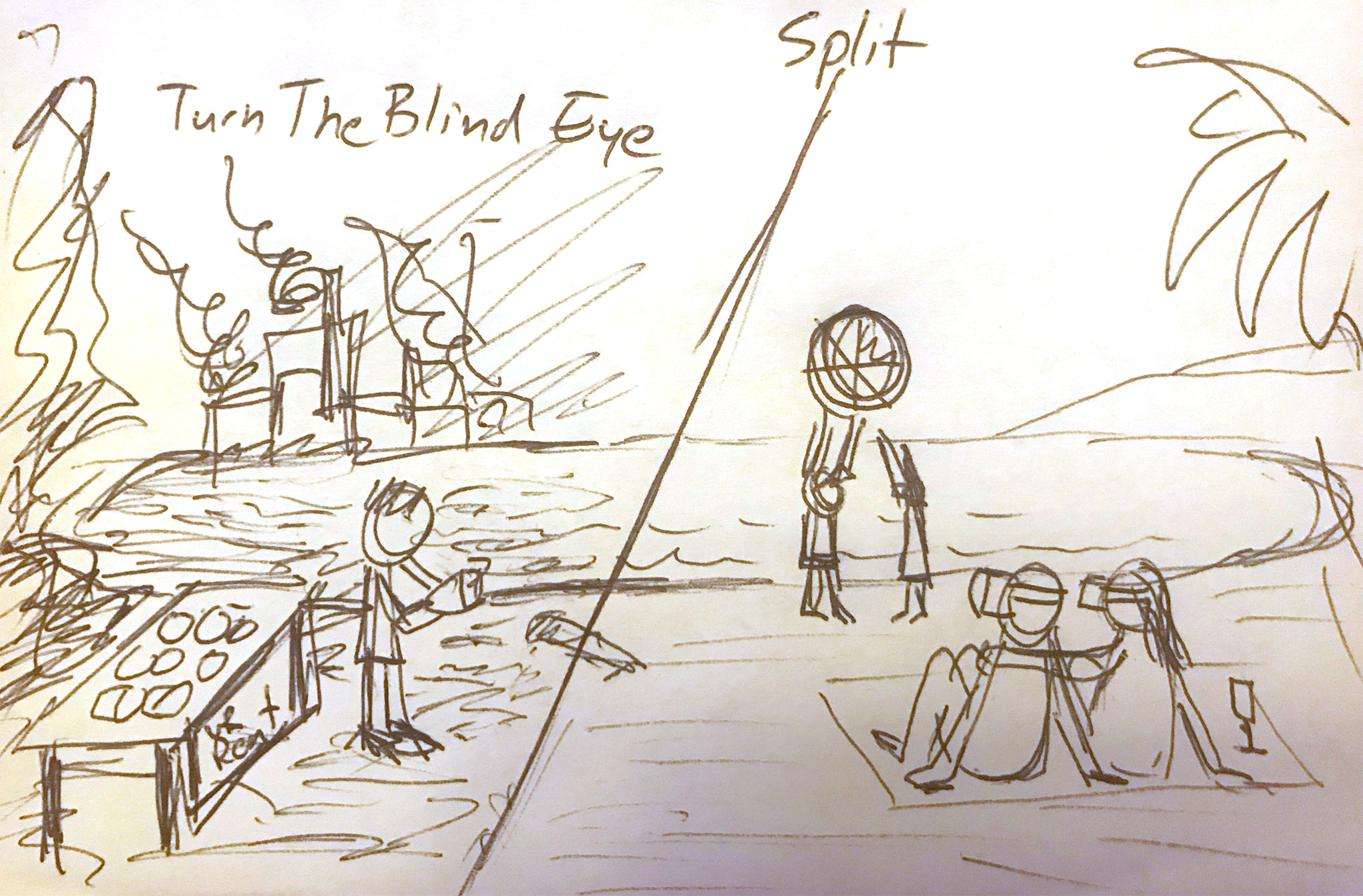 I was on one of my workshop trips, this time I was heading to Belgium to have a couple of workshops with Chromaluxe. I was browsing through the Finnair magazine and came across an article about the plastic pollution in the ocean and how people try to clean the garbage we just throw there. Maybe the idea had been brewing in my head already earlier, but now I had a flash image in my mind, a dystopia located in our not-so-distant future. I pulled my faithful Moleskine notebook out of my bag and started sketching an image split in two halves: a polluted beach with a couple fitting on virtual glasses and an “Alternate reality” where people see their fantasy world through VR, turning a blind eye to all the shit we have caused to our environment.