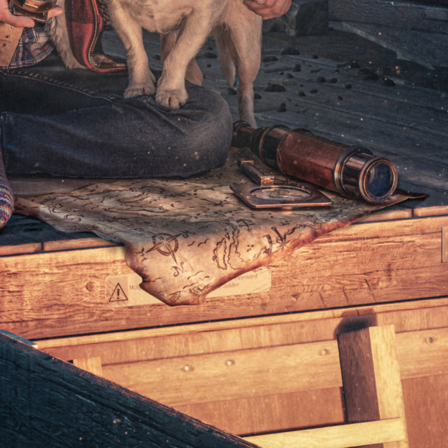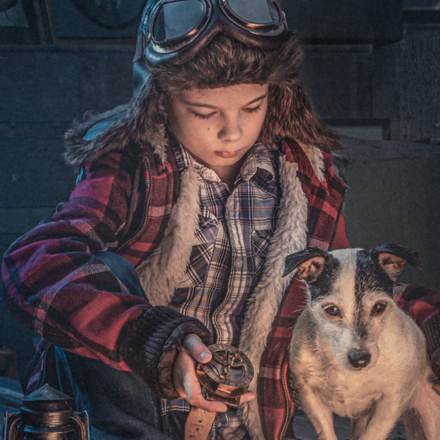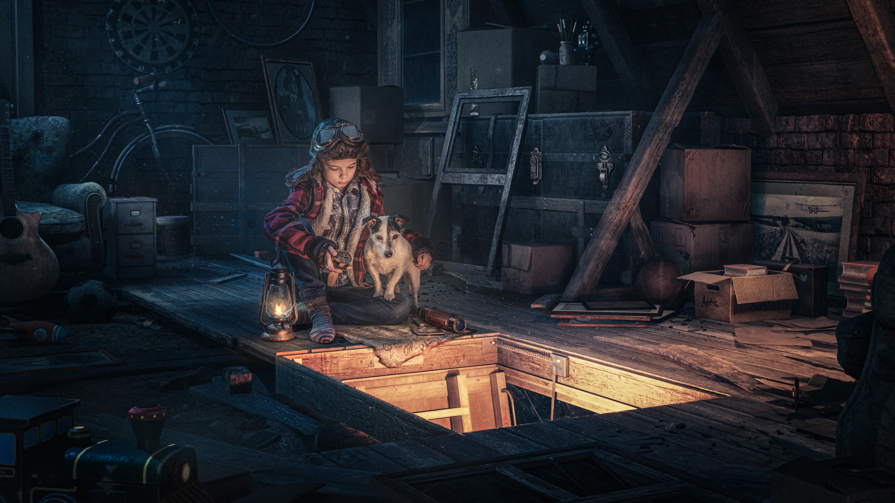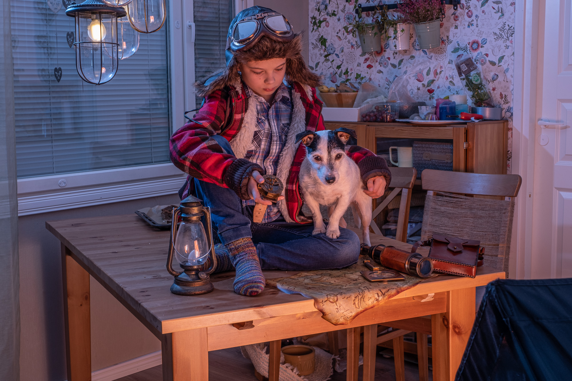 In my latest image called “Beginning of an adventure” I built up a story of a boy whose dad or grandad was an airforce pilot. The boy has sneaked up to the attic filled with old toys, boxes, and pictures, planning an adventure together with his faithful dog after finding an old treasure map. For the image, I started creating the background months ago before the photoshoot. Since I did not have access to an attic I envisioned in my head I had to think outside the box and do the whole thing in a different way. Using some stock images and 3D elements I created the attic just the way I wanted. I collected all the needed props and clothes for the photo shoot, but I was still missing one important item for the perfect look: a pair of old aviator glasses. Finally, my friend Jani from the amazing company Bard & Jester sent them to me and I was ready to put it all together. I spent all of 15 minutes shooting the perfect frame with a help of my “dog whisperer” wife and some hours to put all the pieces together in photoshop.