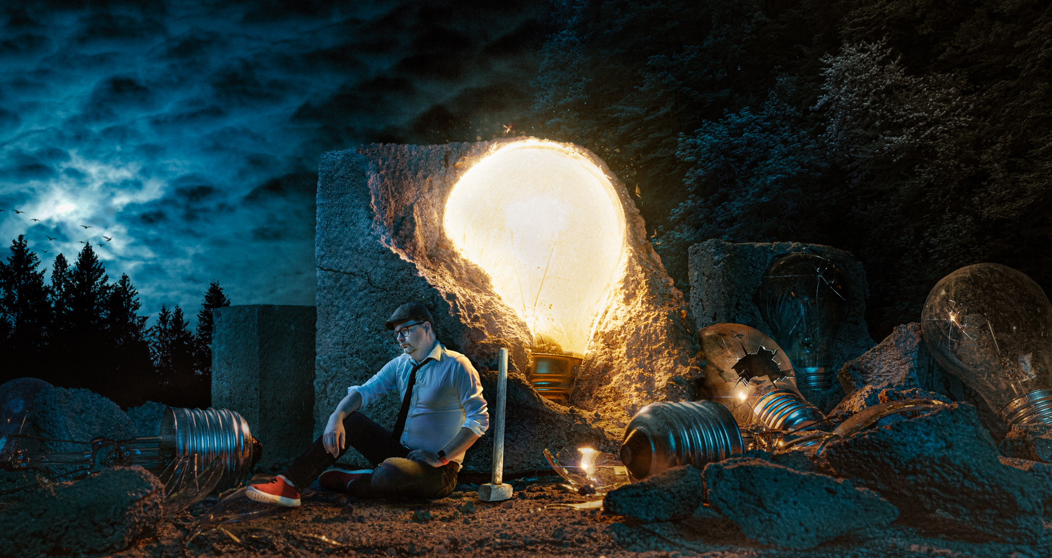 For this image, I went full-on craft mode and made various concrete blocks myself, placed a lightbulb inside of them, and in one I put a battery-operated lightbulb to get realistic light and shadows to the elements. Hours of crafting, planning, photoshoot, and retouching, even modeling, since it seemed only right to be the one portraying the frustration that started all this.