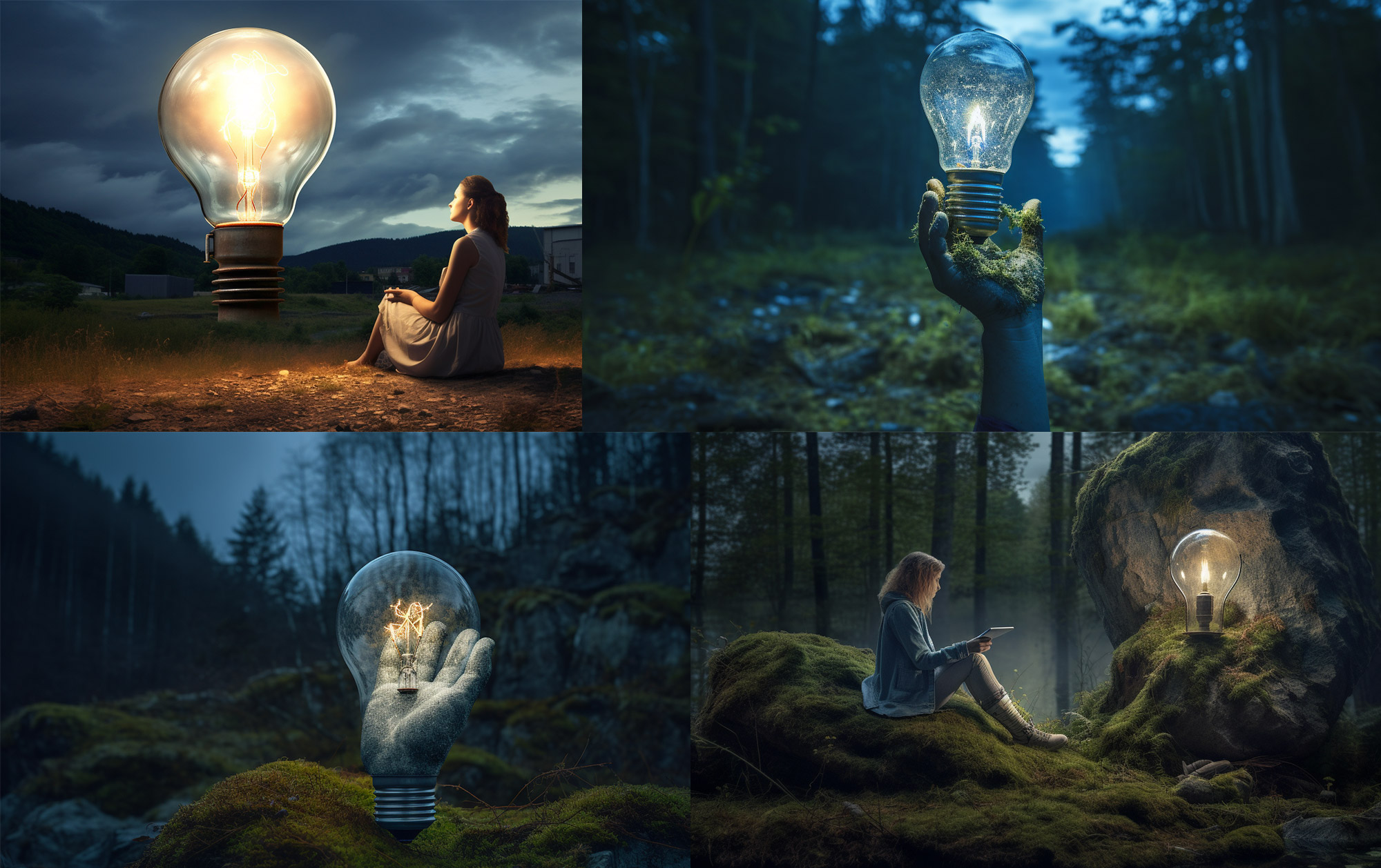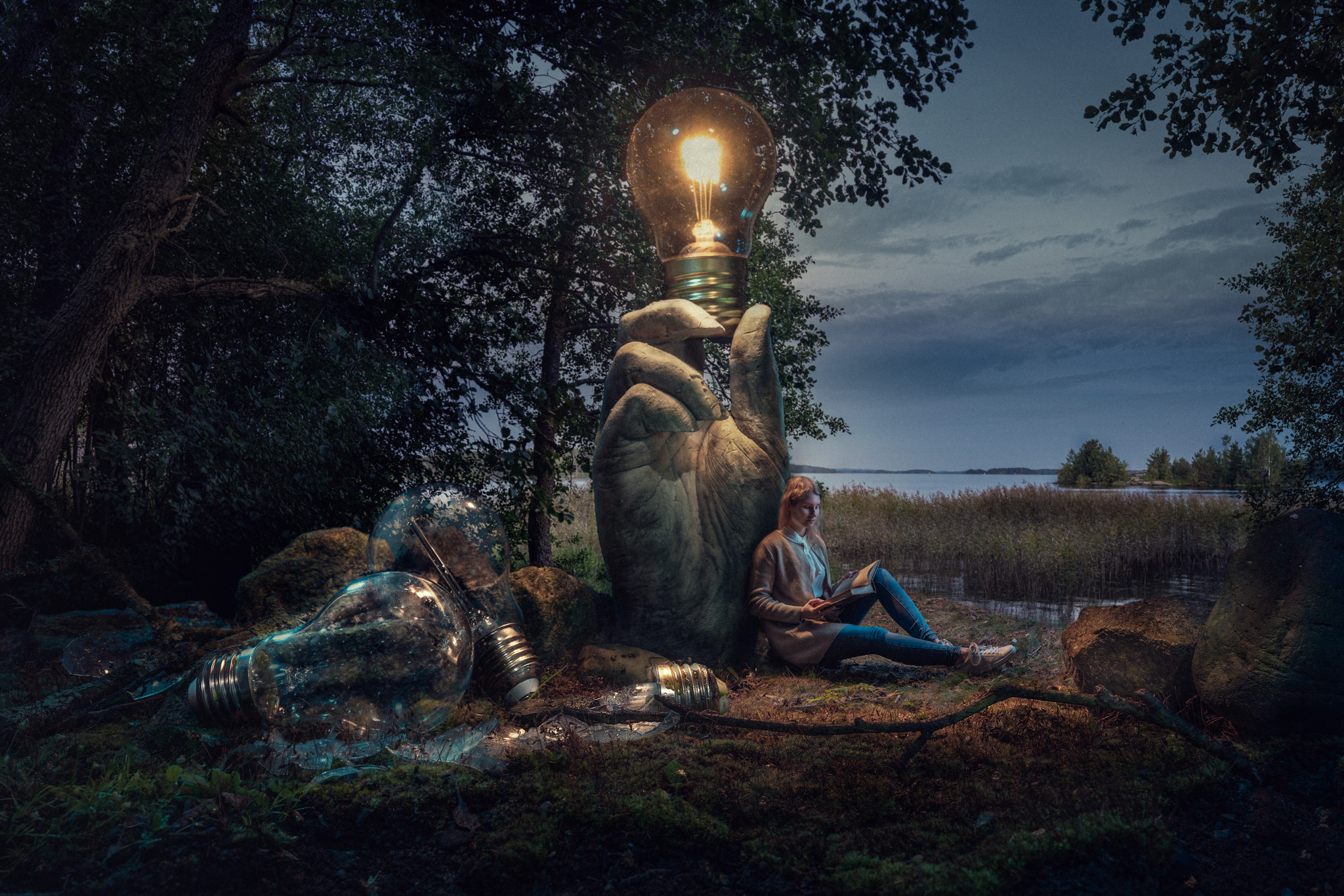 I conceptualized a scene where a woman finds herself amidst nature, accompanied by a colossal hand emerging from the ground and grasping a giant light bulb. This artwork, titled “Inspiration Illuminated,” serves as a sort of sequel to my previous piece, “Creative Block.” Through this endeavor, my objective was to demonstrate that I can craft captivating narrative-driven images without relying on AI tools or stock imagery. Each minute detail within the composition was crafted by hand or captured in the natural environment. Of course, putting it all together in Photoshop and other Adobe tools.