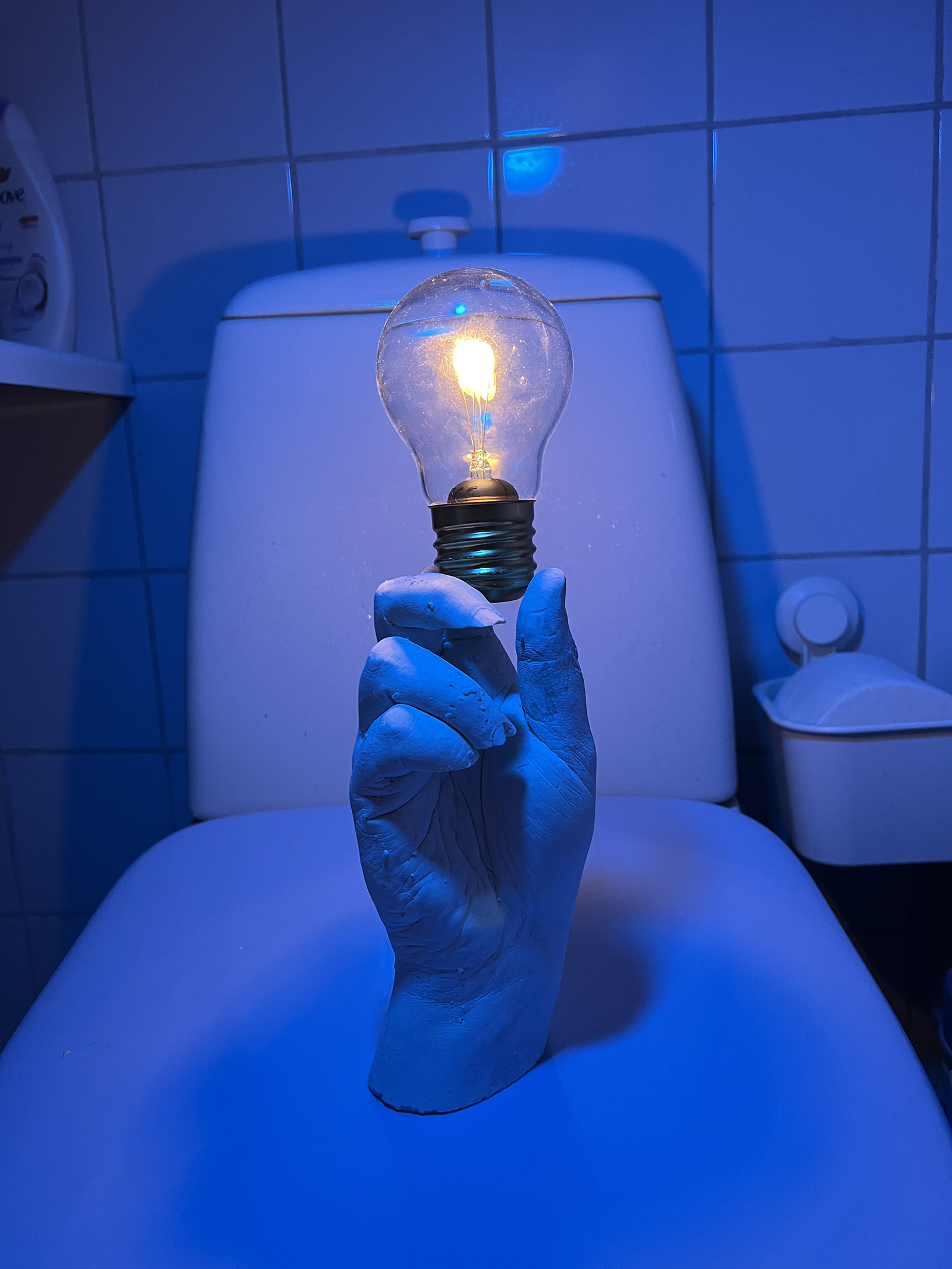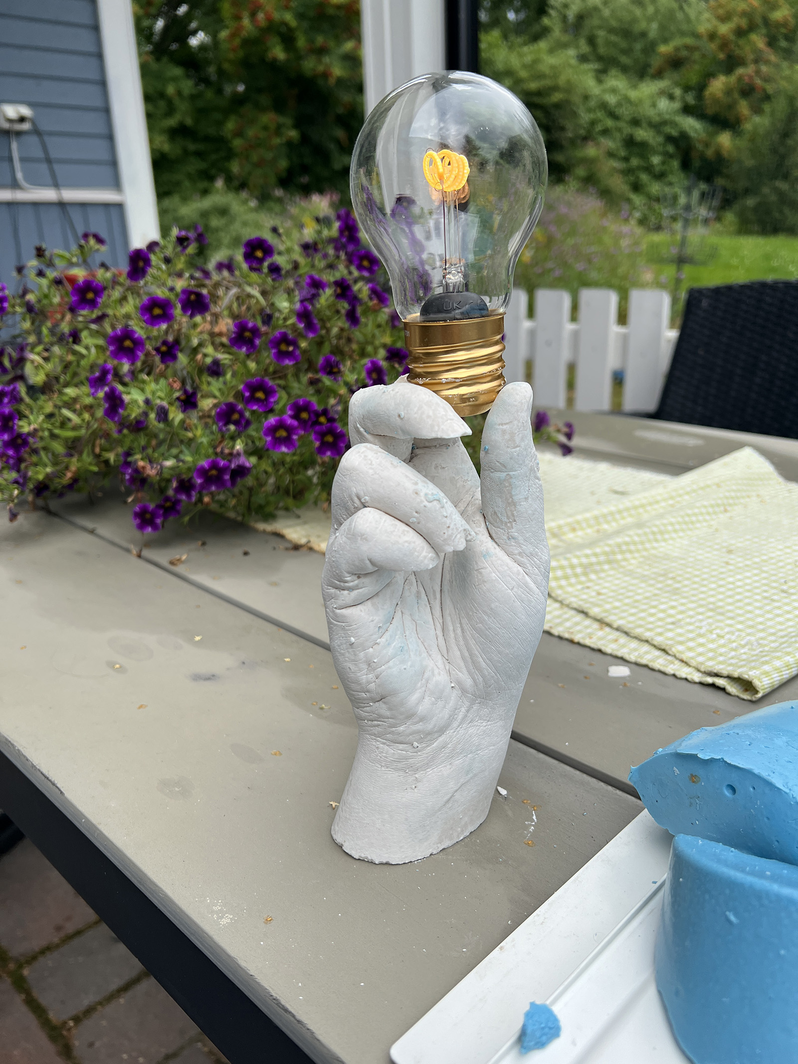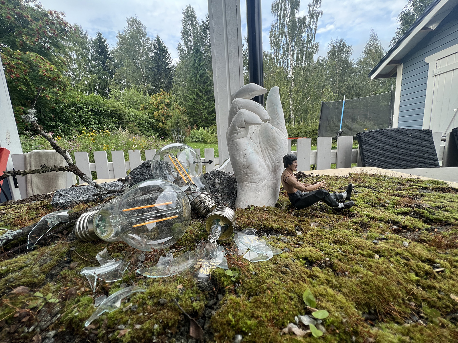 The creative process started with an idea and sketching, followed by the crafting of each element. I crafted the hand, first making the plaster mold of my own hand and then using that to create the hand from acrylic resin. You can see the parts of the process in the video below. I also constructed a miniature landscape using moss, stones, and intricately painted components outside the table of my house.