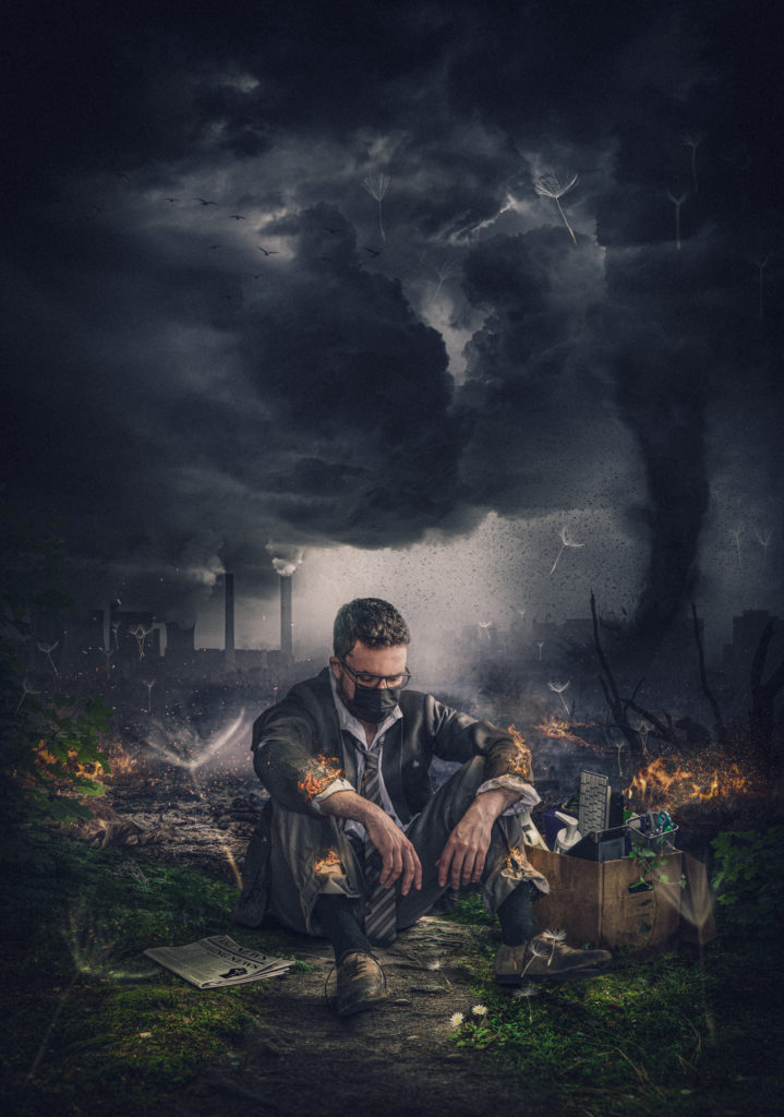 August 2020 found me in a serious need of an outlet for the thoughts occupying my mind, and for me, the best outlet is to create an image. I started with the idea you may have seen in some cartoons already: an image about the COVID pandemic as an immediate threat, which is actually dwarfed by the looming recession and natural disasters brought by climate change. By no means should COVID be downplayed, but the bickering about facemasks should not blind us from seeing the real threat behind pandemics and falling economies: the accelerating increase in global temperatures. This in mind I sketched out an image, trying to bring out the sadness, unfairness, and doomsday feeling of 2020 but leaving in some glimmers of hope for a better tomorrow.